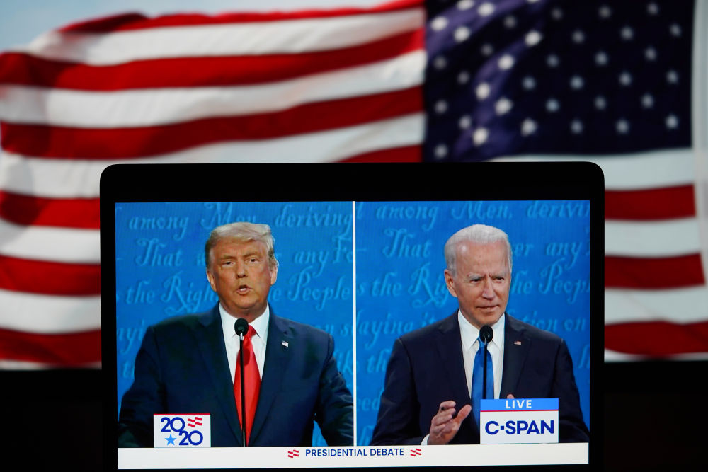 這張2020年10月22日在美國(guó)弗吉尼亞州阿靈頓拍攝的視頻畫(huà)面顯示,時(shí)任美國(guó)總統(tǒng)特朗普(左)與民主黨總統(tǒng)候選人拜登在田納西州納什維爾市參加最后一場(chǎng)總統(tǒng)候選人電視辯論。新華社記者劉杰攝