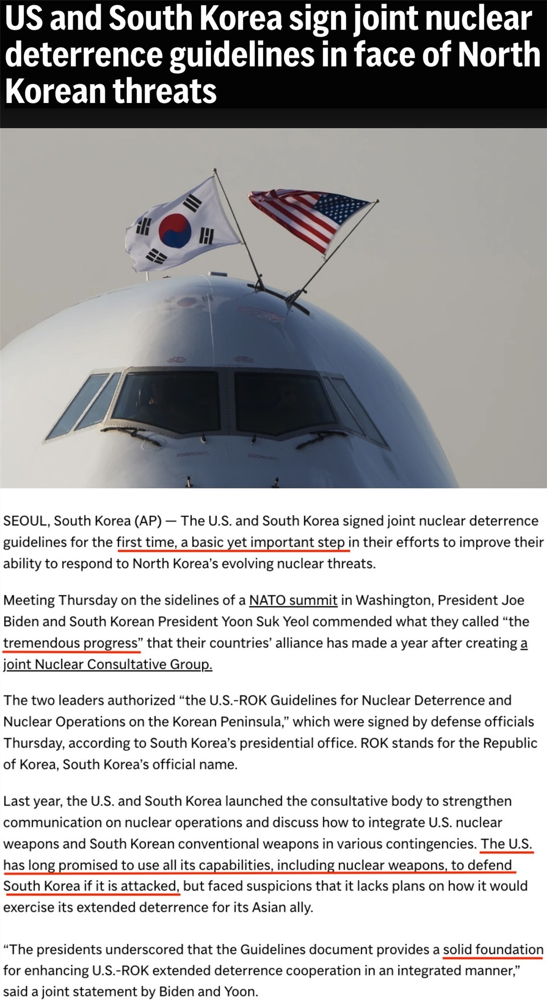 本月11日,在北約華盛頓峰會間隙,美韓兩國國防部官員簽署《美韓關(guān)于朝鮮半島核威懾與核作戰(zhàn)的指導(dǎo)方針》。這也是兩國首次簽署此類文件,被認為是“兩國努力提高應(yīng)對朝鮮核威脅能力的基本且重要的一步”。