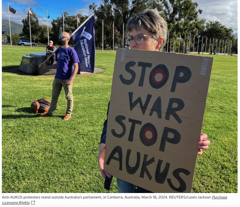 △反 AUKUS 人士在澳大利亞議會外舉行抗議(圖自路透社)