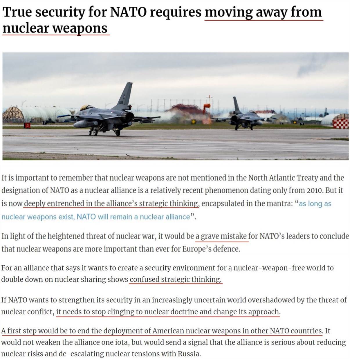 文章指出,《北大西洋公約》中并沒有提到核武器,但如今,它已深深根植于北約的戰(zhàn)略思想之中。鑒于核戰(zhàn)爭危險的加劇,北約領(lǐng)導(dǎo)人如果斷定核武器對歐洲防務(wù)比以往任何時候都重要,那將是一個嚴重的錯誤。