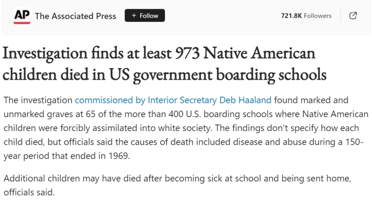 美國內政部公布的這份調查報告顯示,至少有973名美國原住民兒童在截至1969年的150年間死于美國政府管理的印第安寄宿學校。調查結果沒有具體說明每個孩子是如何死亡的,但有調查人員稱,死亡原因包括疾病和虐待。