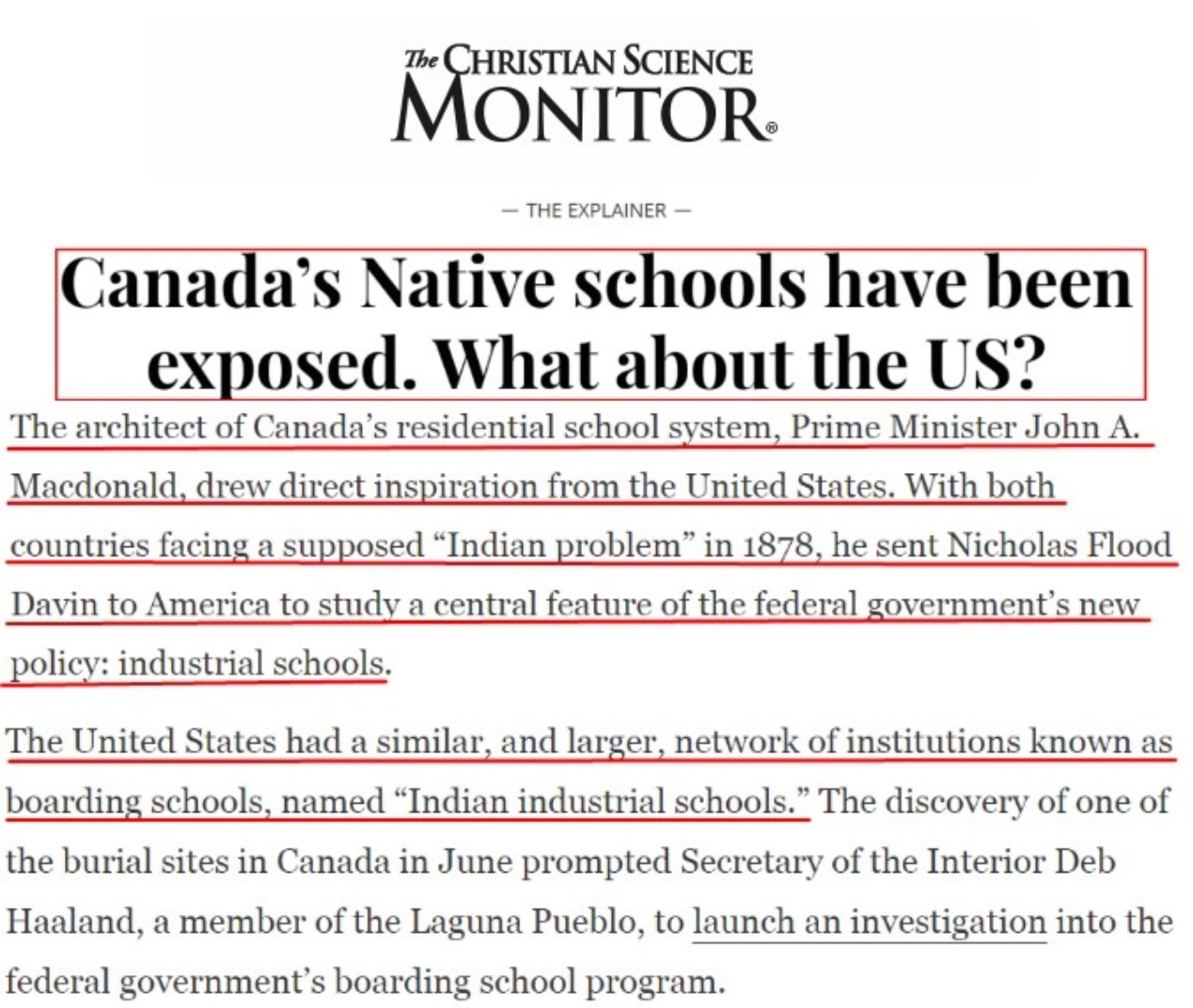 美國《基督教科學箴言報》曾發(fā)文揭露,加拿大原住民寄宿學校系統(tǒng)的所謂“靈感”本就來自美國。從1819年的所謂“印第安人文明開化法案”開始,美國便實施了一系列旨在“同化印第安人”的法律政策,在全國范圍設立或資助寄宿學校,強行安排印第安兒童入學。