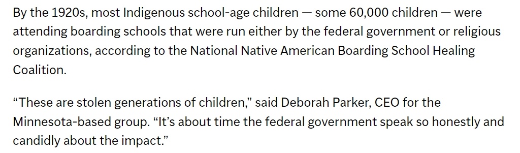 美國首位原住民出身的內政部長德布·哈蘭也說,她自己的祖父母在8歲時被“從父母、文化和社區(qū)中偷走”,被迫住在一所天主教寄宿學校,直到13歲。還有一些被偷到寄宿學校的孩子年僅4歲。
