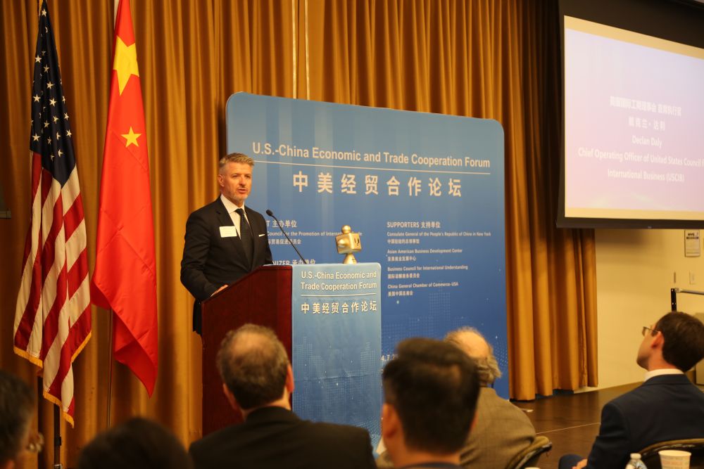 7月29日,在美國紐約,美國國際工商理事會(huì)首席運(yùn)營官戴克蘭·達(dá)利在中國—美國經(jīng)貿(mào)合作論壇上致辭。中國—美國經(jīng)貿(mào)合作論壇29日在紐約市舉行,300余位中美企業(yè)及商協(xié)會(huì)代表出席。新華社記者劉亞南攝