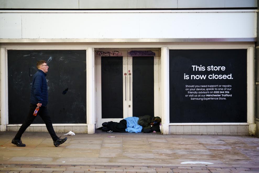 2023年11月22日,在英國曼徹斯特,一名無家可歸者躺在一家關閉的店鋪前。新華社發(fā)(喬恩·休珀攝)