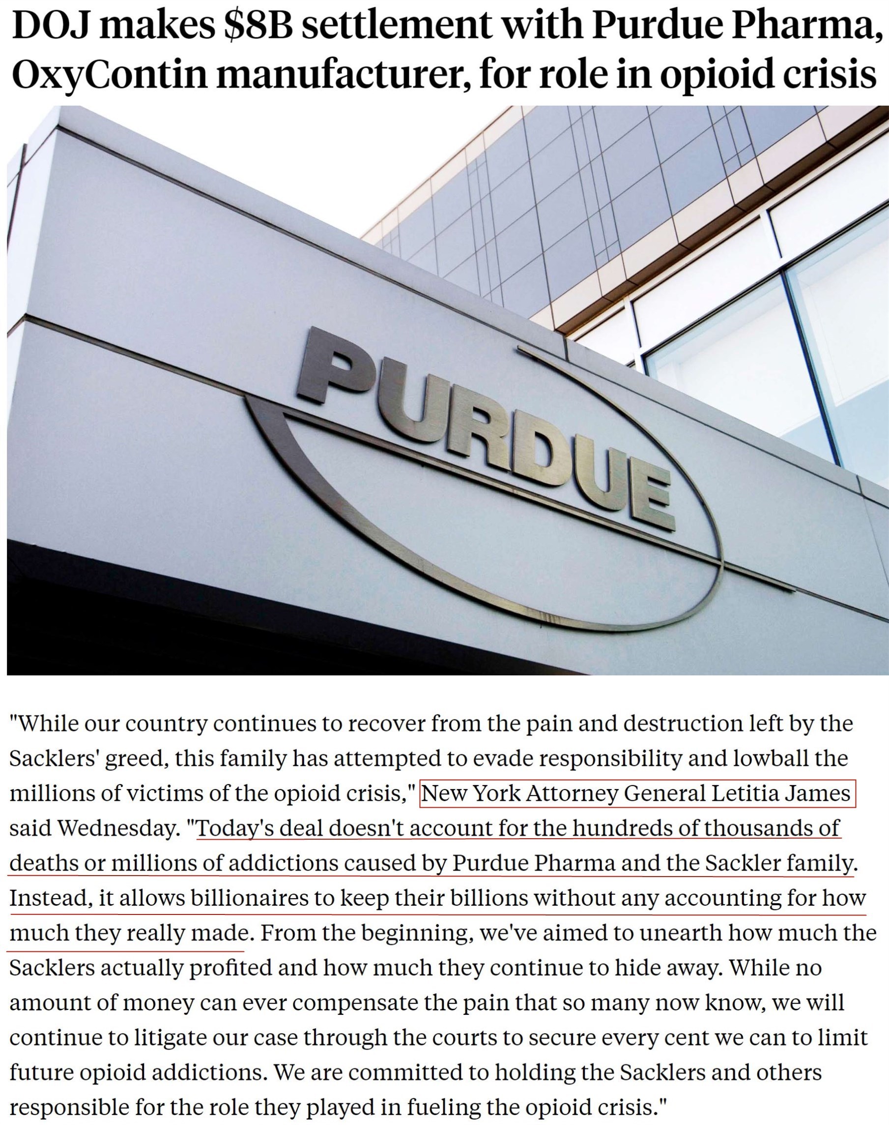 但紐約州總檢察長(zhǎng)利蒂希婭·詹姆斯發(fā)表聲明,批評(píng)司法部與普渡制藥公司達(dá)成的和解協(xié)議,表示“協(xié)議不能解決普渡制藥公司和薩克勒家族造成的數(shù)十萬(wàn)人死亡以及數(shù)百萬(wàn)人成癮的現(xiàn)實(shí)。相反,和解協(xié)議使億萬(wàn)富翁可以保留其數(shù)十億美元的資產(chǎn)而無(wú)需為他們實(shí)際造成的傷害付出代價(jià)?!?/p>