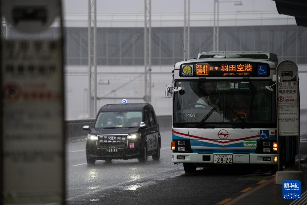 8月16日,在日本東京羽田機場,車輛行駛在暴雨中。新華社記者 張笑宇 攝