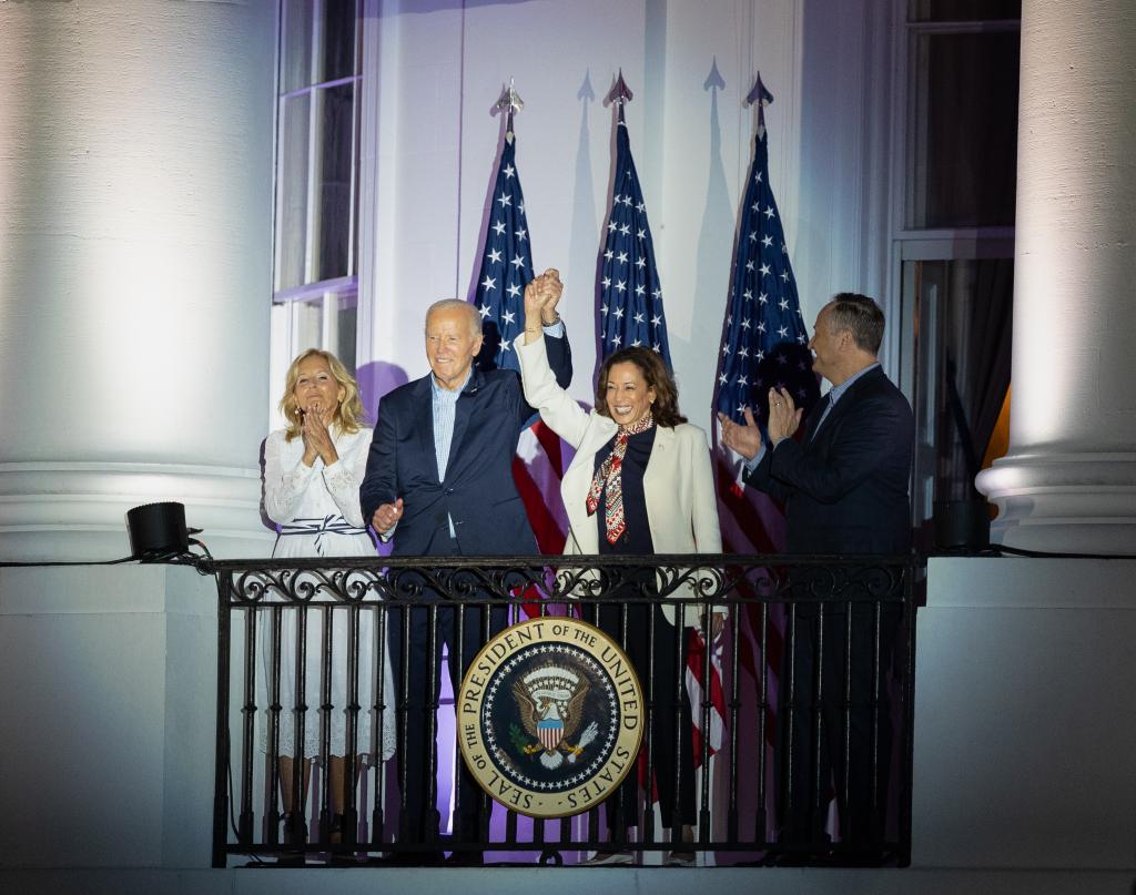 這是7月4日在美國首都華盛頓白宮拍攝的美國總統(tǒng)拜登(左二)和副總統(tǒng)哈里斯(右二)。新華社記者胡友松攝