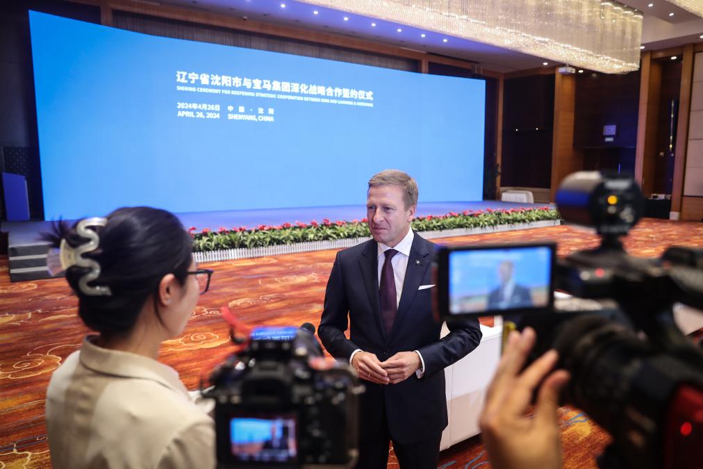 2024年4月26日,寶馬集團(tuán)董事長(zhǎng)齊普策在遼寧省沈陽市與寶馬集團(tuán)深化戰(zhàn)略合作簽約儀式現(xiàn)場(chǎng)接受采訪。新華社記者潘昱龍攝