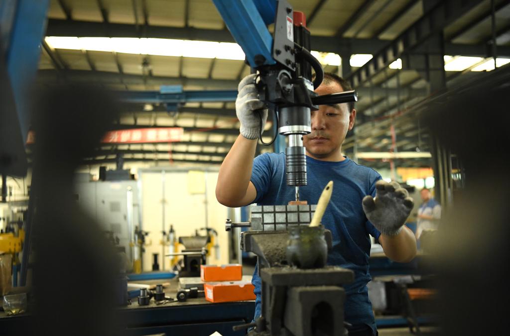 2024年7月30日,在長(zhǎng)春吉林通用機(jī)械(集團(tuán))有限責(zé)任公司模具裝配生產(chǎn)線,鉗工在進(jìn)行攻絲操作。近年來,吉林通用機(jī)械(集團(tuán))有限責(zé)任公司通過數(shù)字化改造、智能化升級(jí)提高生產(chǎn)效率,提升產(chǎn)業(yè)競(jìng)爭(zhēng)力,已成為全球鋁加工汽車輕量化零部件知名供應(yīng)商,為奧迪、大眾、寶馬、奔馳、保時(shí)捷等多家品牌主機(jī)廠供應(yīng)零件。新華社記者柳文惠攝