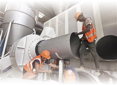 在科特迪瓦阿比讓可可加工廠(chǎng)內(nèi),中科工作人員正在安裝調(diào)試設(shè)備??铺氐贤甙⒈茸尵W(wǎng)記者 希普林·夸西攝