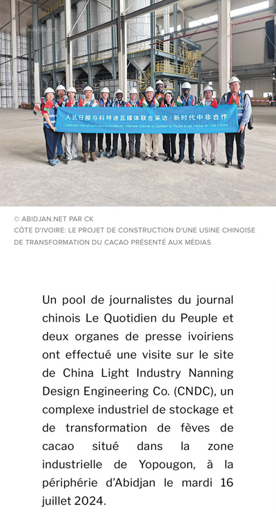 7月16日,人民日?qǐng)?bào)與兩家科特迪瓦新聞機(jī)構(gòu)記者一行參觀(guān)了由中國(guó)輕工業(yè)南寧設(shè)計(jì)工程有限公司總承包的可可加工及可可豆倉(cāng)庫(kù)建設(shè)項(xiàng)目,該項(xiàng)目坐落在阿比讓郊區(qū)的約普貢工業(yè)區(qū)。