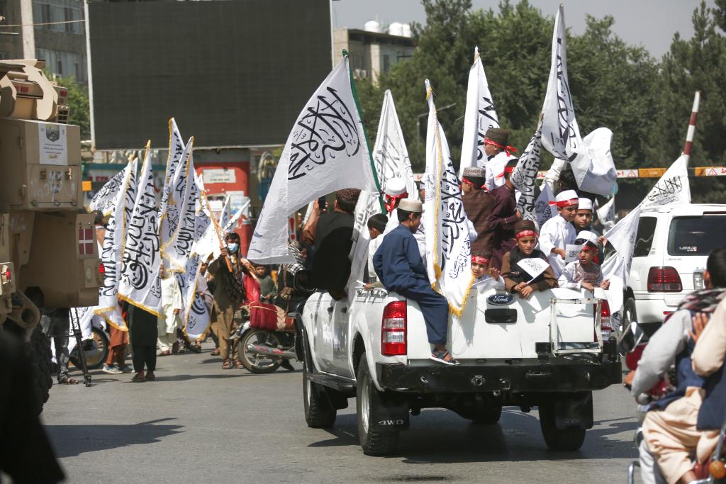 8月14日,人們手持臨時政府的白色旗幟出現(xiàn)在阿富汗首都喀布爾街頭。新華社發(fā)(塞夫拉赫曼·薩菲 攝)