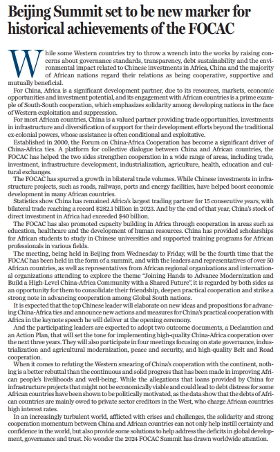 面對危機(jī)與挑戰(zhàn)增多、動(dòng)蕩不安的當(dāng)今世界,中國與非洲國家間展現(xiàn)的團(tuán)結(jié)一致與強(qiáng)勁合作勢頭,不僅可以為世界注入更多確定性和信心,也可以為解決全球發(fā)展、治理和信任赤字提供方案。鑒于此,2024中非合作論壇峰會自然是全球矚目的焦點(diǎn)。