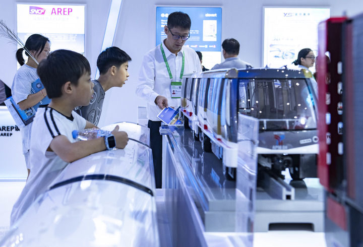 9月21日,在2024世界制造業(yè)大會(huì)上,小朋友參觀體驗(yàn)阿爾斯通跨座式單軌列車(chē)。新華社記者 黃博涵 攝