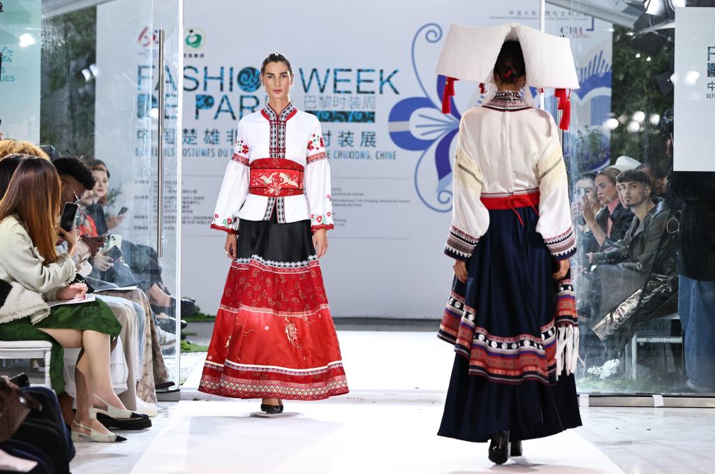 9月26日,模特在法國巴黎舉行的中國楚雄彝族服飾非遺時裝展上展示時裝。新華社記者 高靜 攝