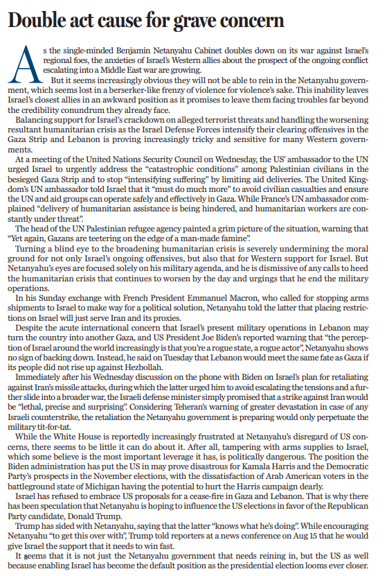 對不斷擴大的人道主義危機視而不見,不僅嚴重損害了以色列軍事行動的道德基礎,也損害了美國和西方支持以色列的道德基礎。內(nèi)塔尼亞胡眼里只有軍事議程,對任何要求他關注人道主義危機、結束軍事行動的呼聲都置之不理,不屑一顧。