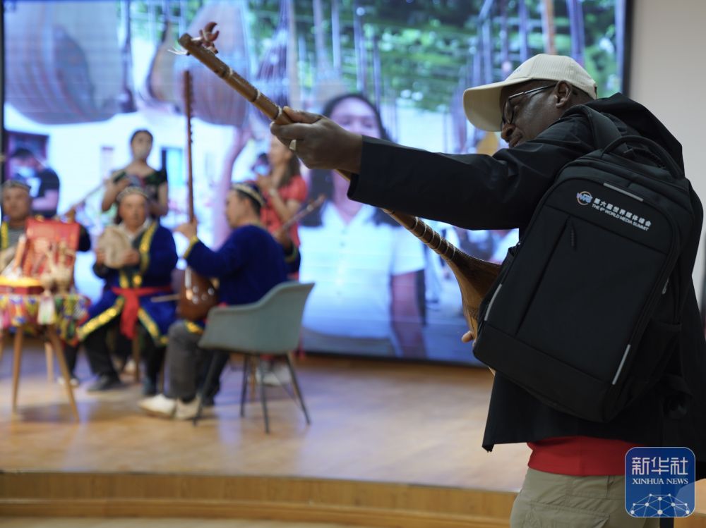 10月15日,與會(huì)嘉賓在阿克蘇地區(qū)新和縣加依村加依手工樂器產(chǎn)業(yè)園體驗(yàn)傳統(tǒng)樂器。 新華社記者 劉夢琪 攝