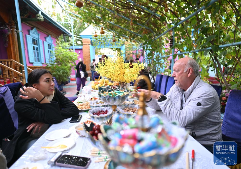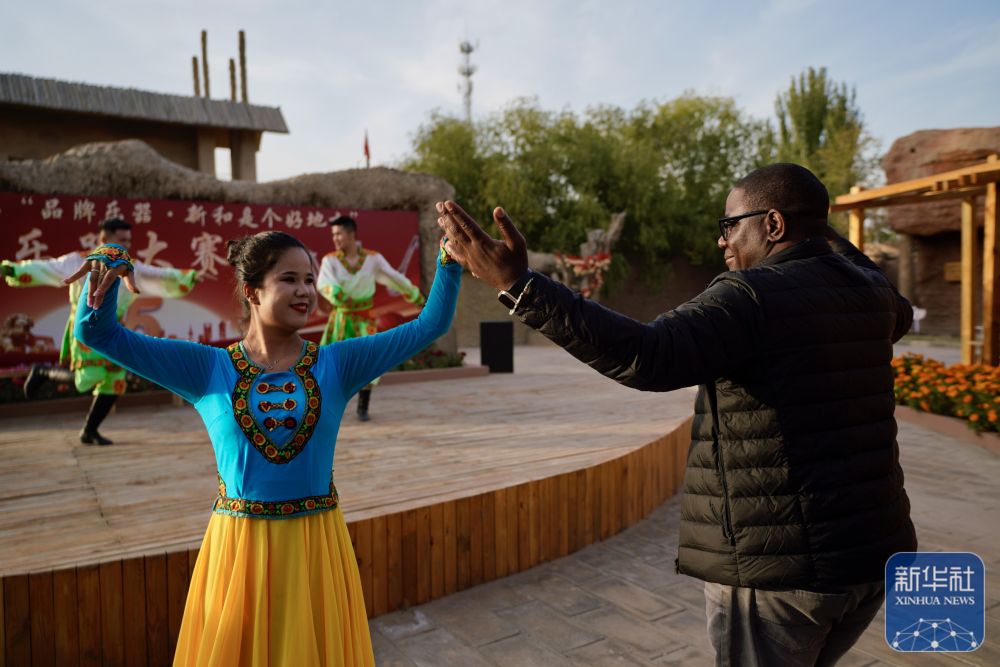 10月15日,與會(huì)嘉賓在伊寧市喀贊其民俗旅游區(qū)與表演者互動(dòng)。 新華社記者 牟宇 攝