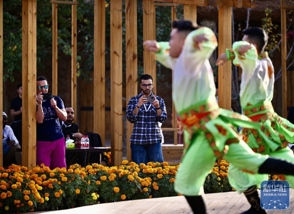10月15日,與會(huì)嘉賓在阿克蘇地區(qū)新和縣加依村龜茲文化樂器展示中心欣賞舞蹈表演。 新華社記者 陳朔 攝
