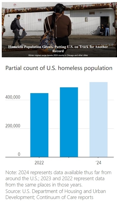 日前,美國(guó)《華爾街日?qǐng)?bào)》對(duì)全美超過(guò)250個(gè)覆蓋城市和農(nóng)村地區(qū)的無(wú)家可歸者服務(wù)組織的數(shù)據(jù)進(jìn)行分析后發(fā)現(xiàn),上述地區(qū)無(wú)家可歸者的數(shù)量較去年同期增加了約10%。這一趨勢(shì)表明,美國(guó)今年無(wú)家可歸者人數(shù)可能會(huì)超過(guò)2023年估計(jì)的65.3萬(wàn)人,這是自2007年有記錄以來(lái)的最高數(shù)字。