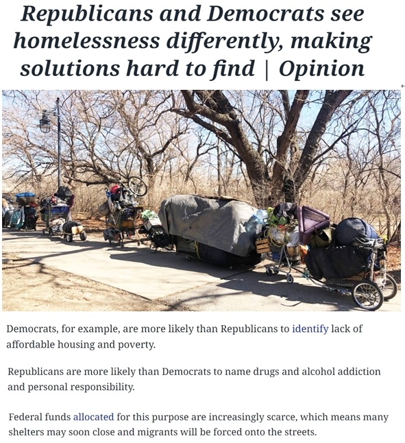 美國(guó)堪薩斯州《威奇托鷹報(bào)》評(píng)論稱,兩黨可能永遠(yuǎn)不會(huì)就無(wú)家可歸的原因達(dá)成一致,民主黨傾向于認(rèn)為是結(jié)構(gòu)性或系統(tǒng)性因素導(dǎo)致,而共和黨則更著重宣傳是個(gè)人因素導(dǎo)致。但無(wú)論是民主黨還是共和黨都無(wú)法解決無(wú)家可歸問(wèn)題,他們相左的政策意見(jiàn)讓解決無(wú)家可歸者的問(wèn)題更加艱難,流向需要援助的民眾的資金越來(lái)越少。