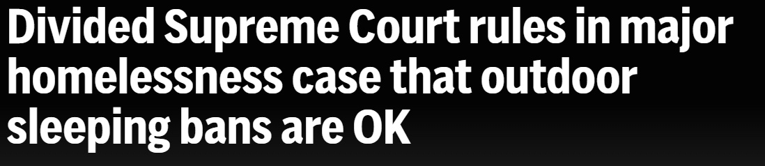 更令人唏噓的是,面對(duì)越來(lái)越多的人流浪街頭,今年6月底,美國(guó)最高法院以6:3的判決結(jié)果,允許各地政府實(shí)施禁止無(wú)家可歸者在戶外露宿的禁令。