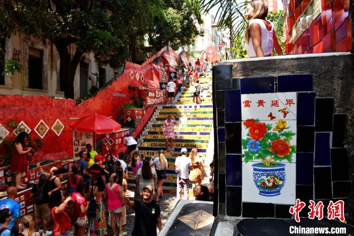 跟隨里約熱內(nèi)盧共和國博物館研究員安德烈·安迪·安古洛,中新社記者來到里約熱內(nèi)盧聞名遐邇的城市地標(biāo)——塞拉隆階梯。這是由智利藝術(shù)家塞拉隆歷時(shí)20余年打造的“彩色階梯”。