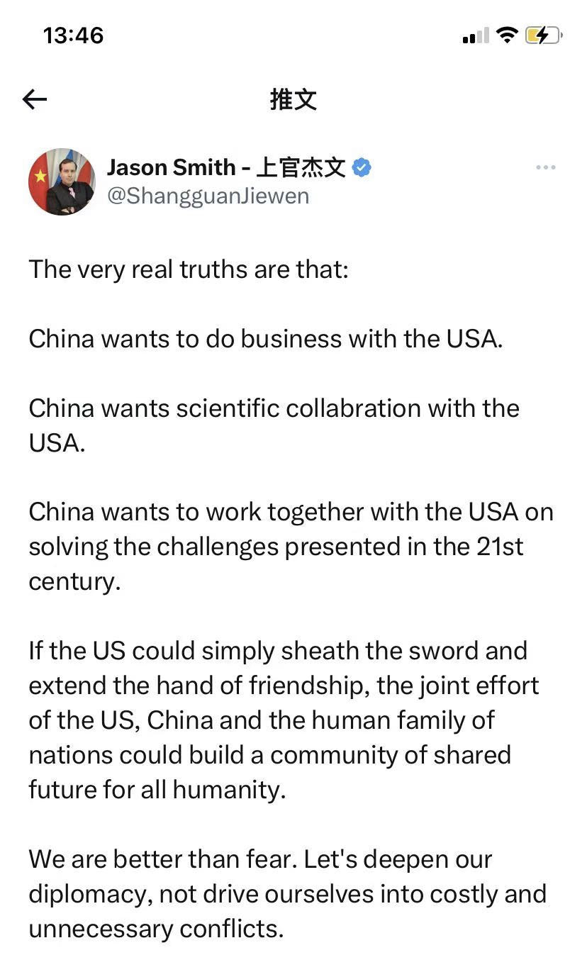 他在推特中稱,“真正的事實是,中國愿意與美國做買賣、進行科學(xué)合作,并共同解決21世紀(jì)面臨的挑戰(zhàn)。如果美國能夠停止敵對行動,并伸出友誼之手,中美兩國和全人類大家庭可以共同努力構(gòu)建人類命運共同體。我們比恐懼更強大,讓我們深化外交關(guān)系,避免陷入代價高昂且不必要的沖突中。”