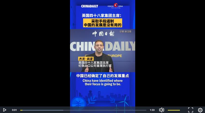 12月5日,由中國日報社主辦、對外經(jīng)濟貿(mào)易大學協(xié)辦的“新時代大講堂”活動在北京舉行。英國四十八家集團主席、倫敦出口公司CEO杰克·佩里在視頻演講中提到“對中國發(fā)展采取遏制手段是沒有用的”,他說“中國的各種活動和博覽會邀請了所有人,沒有誰會被中國拒之門外”。