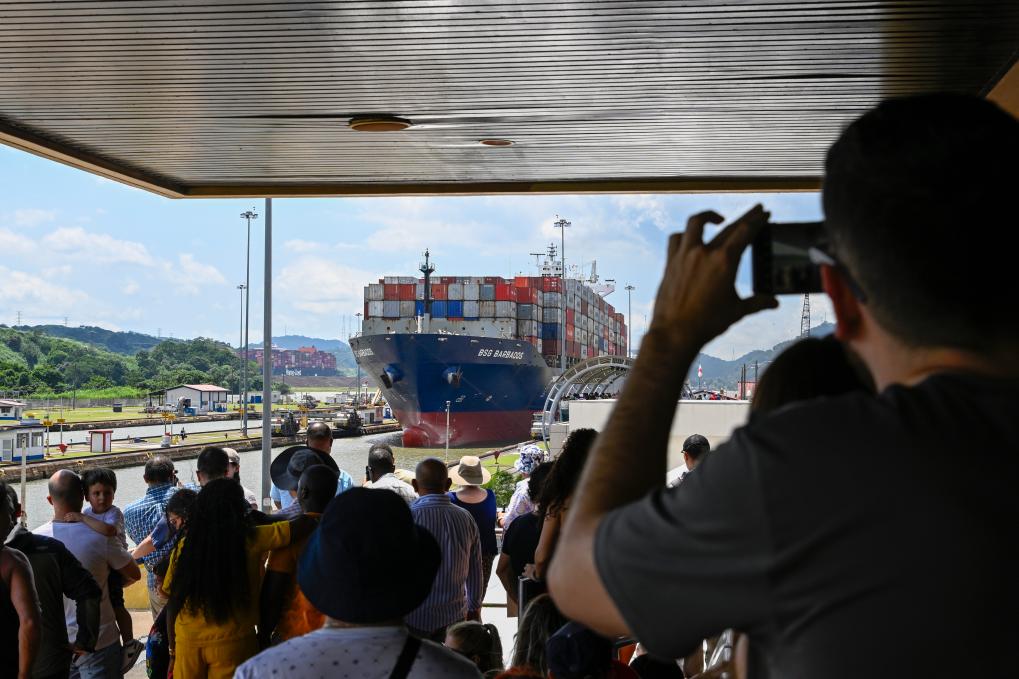 8月28日,在巴拿馬首都巴拿馬城附近,游客在巴拿馬運(yùn)河的米拉弗洛雷斯船閘游客中心觀看貨輪通過(guò)船閘駛?cè)胩窖?。新華社記者李木子攝