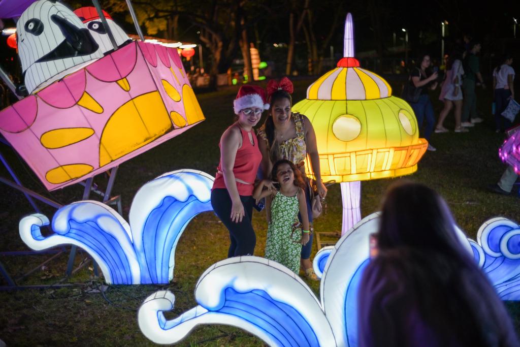 12月23日,在巴拿馬首都巴拿馬城的奧馬爾公園,觀眾在中國彩燈展上拍照留念。新華社記者陳昊佺攝