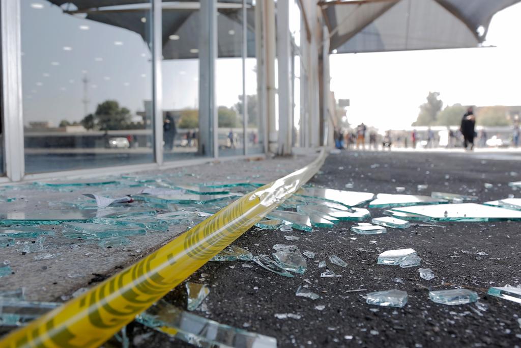 這是12月27日在也門薩那國際機場拍攝的地面上破碎的玻璃。新華社發(fā)(穆罕默德·穆罕默德攝)