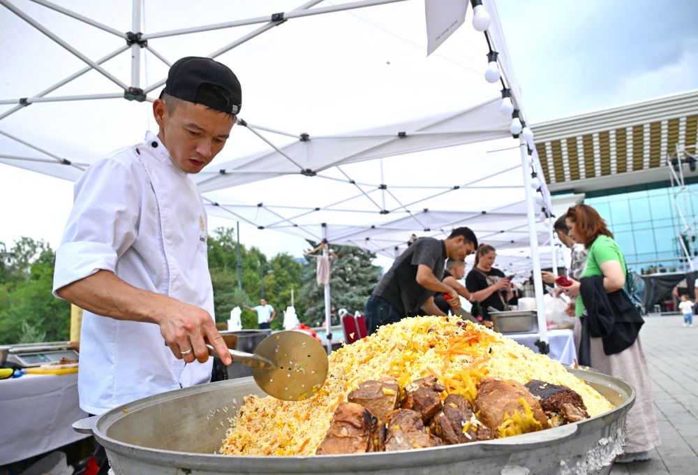 2024年8月24日,在哈薩克斯坦阿拉木圖美食節(jié)上,廚師制作手抓飯。新華社發(fā)(阿拉木圖市旅游局供圖)