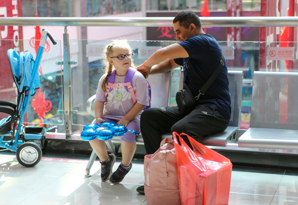 2024年7月26日,在中哈霍爾果斯國(guó)際邊境合作中心,來(lái)自哈薩克斯坦的游客在購(gòu)物后休息。新華社記者林立平攝