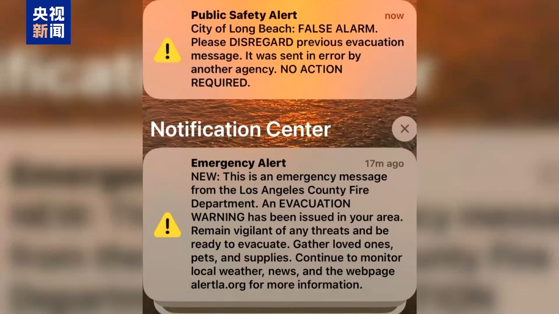 央視記者 劉驍騫:與此同時(shí),根據(jù)我在一線的觀察,人為造成的災(zāi)害正在出現(xiàn)。首先,洛杉磯縣的警報(bào)發(fā)布系統(tǒng)嚴(yán)重失靈,造成撤離信息的混亂。一般情況下,如果你所在的區(qū)域處于撤離預(yù)警或者需要立刻撤離的范圍內(nèi),手機(jī)就會(huì)收到由洛杉磯縣發(fā)布的政府警報(bào)。第一次發(fā)生警報(bào)失靈的情況是10日3時(shí)左右,我的手機(jī)發(fā)出巨大的警報(bào)聲,短信內(nèi)容顯示“我居住的區(qū)域需要立刻撤離”,但是我打開(kāi)窗,發(fā)現(xiàn)室外并沒(méi)有煙味,我立刻登錄了另外幾個(gè)災(zāi)難預(yù)警app,也沒(méi)有發(fā)現(xiàn)周遭有新的山火出現(xiàn)。幾乎在同一時(shí)間,很多生活在洛杉磯不同區(qū)域的網(wǎng)友都表示收到了這條警報(bào)。在10日的白天,類似的錯(cuò)誤警報(bào)幾乎每隔幾小時(shí)就出現(xiàn)一次,普通居民也從一開(kāi)始收到警報(bào)時(shí)的緊張,變成麻木,有的人為了避免過(guò)于焦慮,甚至在手機(jī)設(shè)置中關(guān)掉了政府警報(bào)通知。