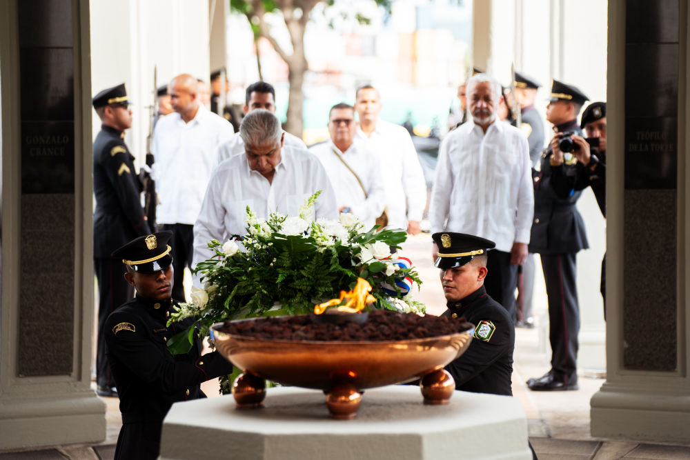 1月9日,在巴拿馬首都巴拿馬城,巴拿馬總統(tǒng)穆利諾(前中)向紀(jì)念1964年“護(hù)旗運(yùn)動(dòng)”的“永恒之火”紀(jì)念碑獻(xiàn)花圈。新華社記者許詠政攝