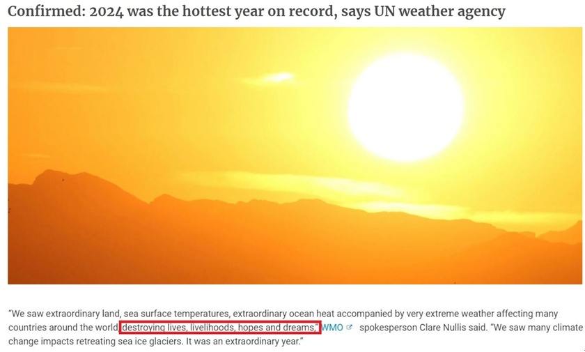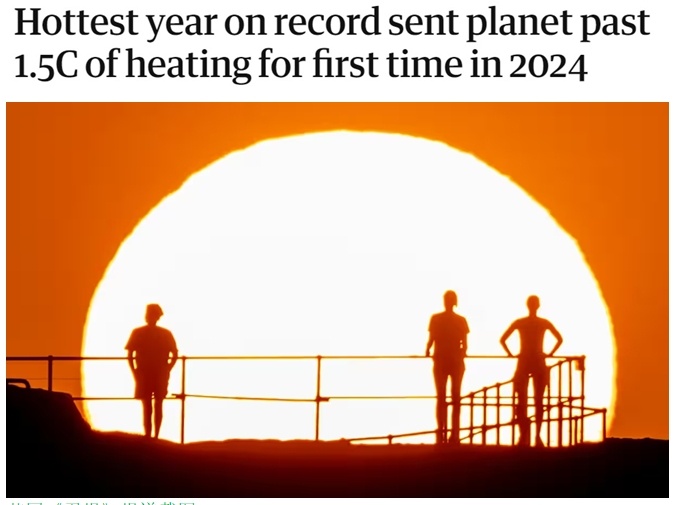 根據(jù)該組織對多份國際數(shù)據(jù)的綜合分析,2024年全球平均氣溫比工業(yè)化前平均水平高出約1.55攝氏度,是首個該差額超過1.5攝氏度的年份。