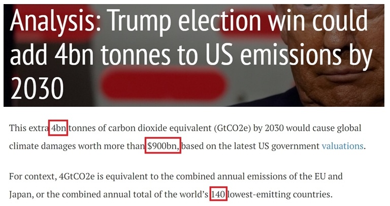 有報告指出,相對于目前水平,特朗普的再度掌權將讓美國到2030年的碳排放累計增加40億噸二氧化碳當量,比全球排放量最少的140個國家的排放總和還要多。