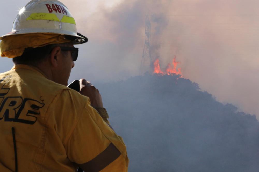 1月11日,消防員在美國加利福尼亞州洛杉磯曼德維爾峽谷的一座山丘頂部觀望野火火勢。新華社發(fā)(邱晨攝)