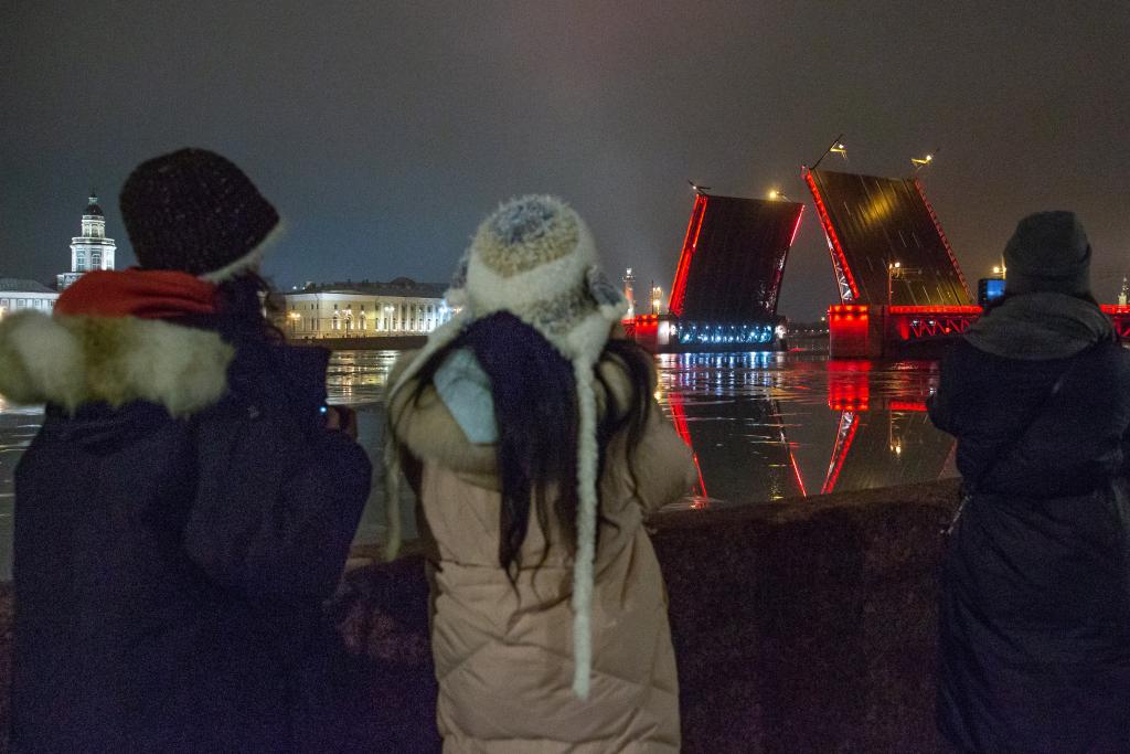 1月29日凌晨,在俄羅斯圣彼得堡,人們?cè)谀吆优嫌^看亮起“中國(guó)紅”的冬宮橋開橋。新華社發(fā)(莫京娜攝)