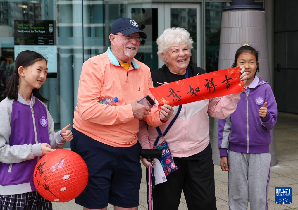2月1日,在新西蘭首都惠靈頓,當?shù)鼐用裨诙嘣逡嵯灿瓪g樂春節(jié)活動中展示中國書法作品。新華社發(fā)(孟韜攝)