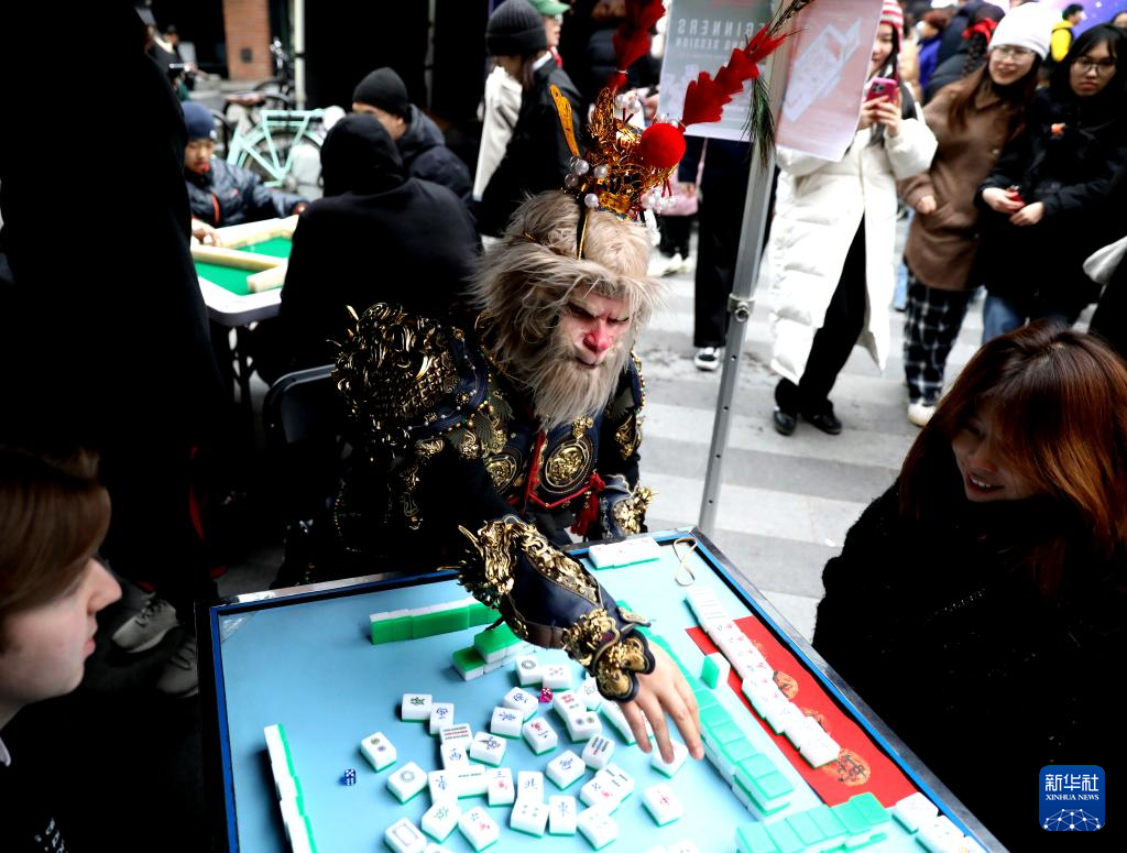 今年,倫敦卡姆登集市首次舉辦了中國春節(jié)慶典活動。喜慶的春節(jié)燈飾高高懸掛,在微風中輕輕搖曳;空氣中彌漫著中式點心的香氣,令人垂涎欲滴。人群中,偶爾可見漢服衣袂翩然掠過,許多人手中還拿著紅色的燈籠和“?!弊帧T趹c典活動上,當?shù)厥忻裾淠荨っ谞栁值乱贿吅爸芭觥?,一邊開心地將麻將桌上的“南風”牌收到面前。她不僅自己打得得心應手,還不時給身邊的新手講解規(guī)則。