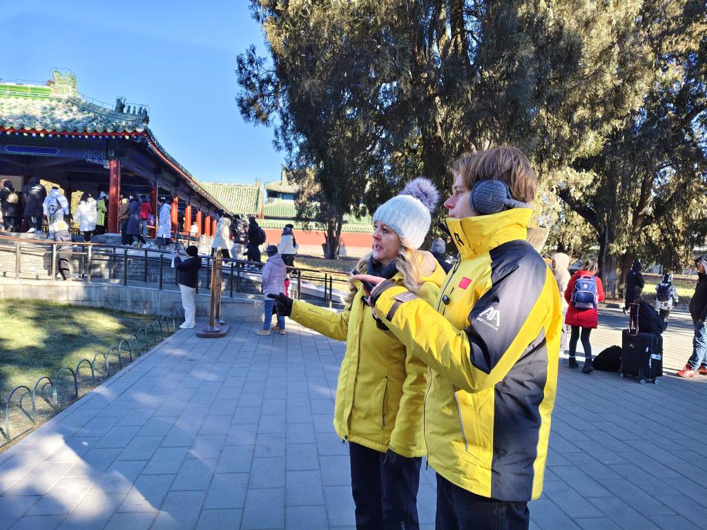 祈年殿、皇穹宇、圜丘……路過一個個景點,記者為他們介紹起建筑背后的歷史和“天人合一”理念,母子二人聽得津津有味。當天北京戶外溫度低至零下8攝氏度,手凍得生疼,但絲毫未影響埃米爾和媽媽拍照記錄的熱情。