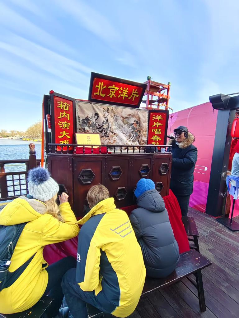 走入北京歷史文化街區(qū)什剎海的新春集市,年味彌漫在文化產(chǎn)品、特色小吃和藝術表演中。不遠處的鑼鼓唱戲聲吸引了母子二人,原來是民間藝術北京洋片在表演《西游記》。坐在一個約1米高、2米寬的木箱前,透過箱上圓孔能看到里面不斷切換的畫片。二人全神貫注的表情,讓人感到不同文化仿佛跨越時空和國度,在這里定格。