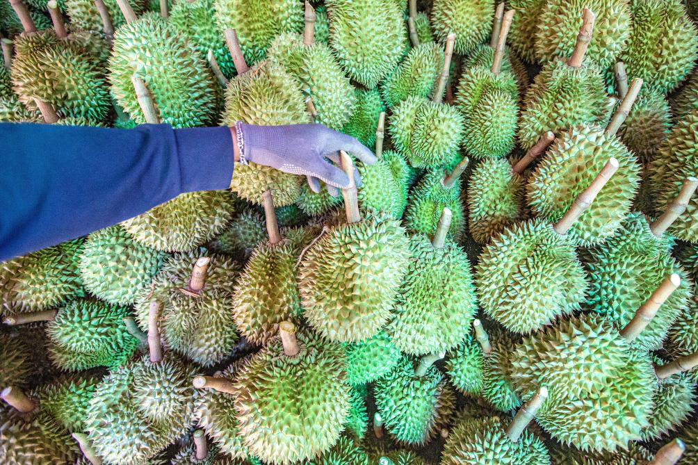 2024年4月26日,在泰國(guó)尖竹汶府,工人在榴蓮園碼放榴蓮。新華社記者王騰攝