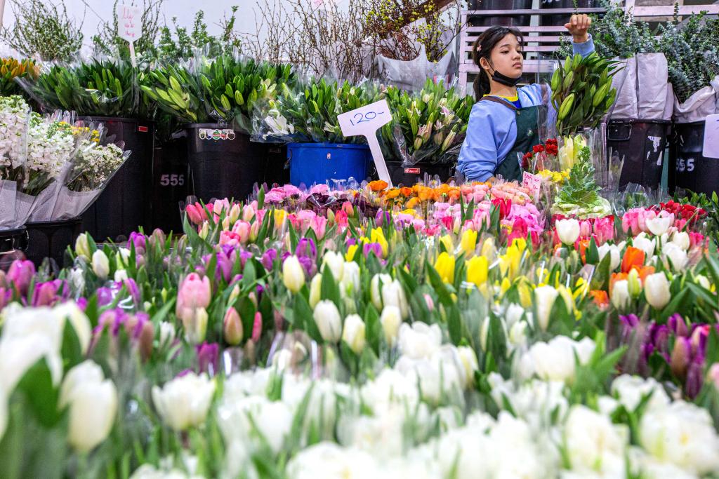 2023年2月21日,工作人員在泰國(guó)曼谷帕空鮮花市場(chǎng)包裝來(lái)自云南的鮮花。新華社記者王騰攝