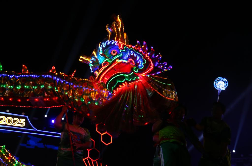 1月26日,演員在泰國(guó)那空沙旺湄南河畔舉行的春節(jié)慶?;顒?dòng)上表演舞龍。新華社記者孫瑋彤?dāng)z