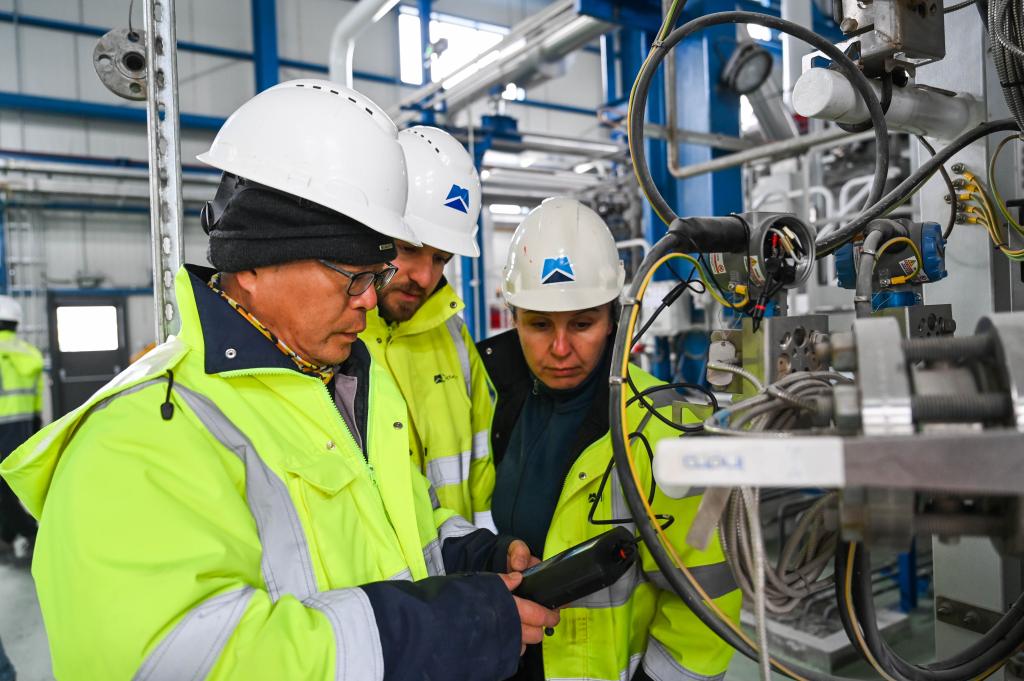 2月12日,中土兩國工程師在土耳其阿克薩拉伊省的圖茲湖地下天然氣儲(chǔ)庫擴(kuò)建項(xiàng)目地面場站查看設(shè)備。新華社記者劉磊攝
