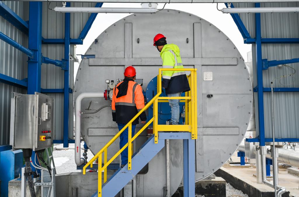 2月12日,中國工作人員在土耳其阿克薩拉伊省的圖茲湖地下天然氣儲(chǔ)庫擴(kuò)建項(xiàng)目地面場站查看設(shè)備。新華社記者劉磊攝